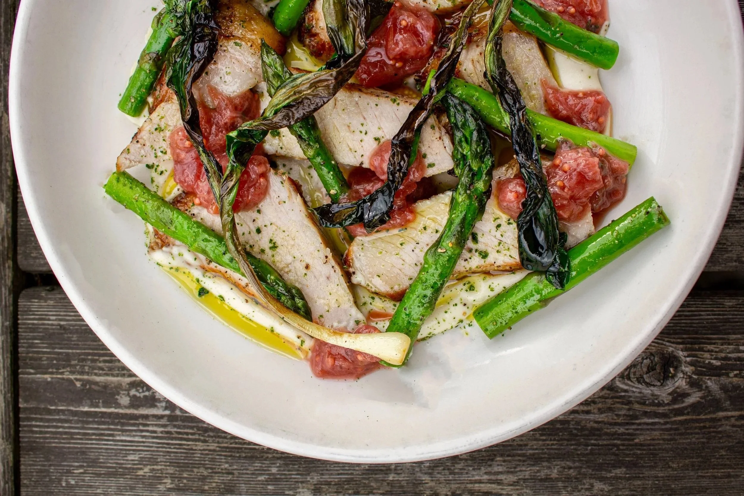 Duroc pork chop | salsify purée | rhubarb mostarda | asparagus | toasted ramps