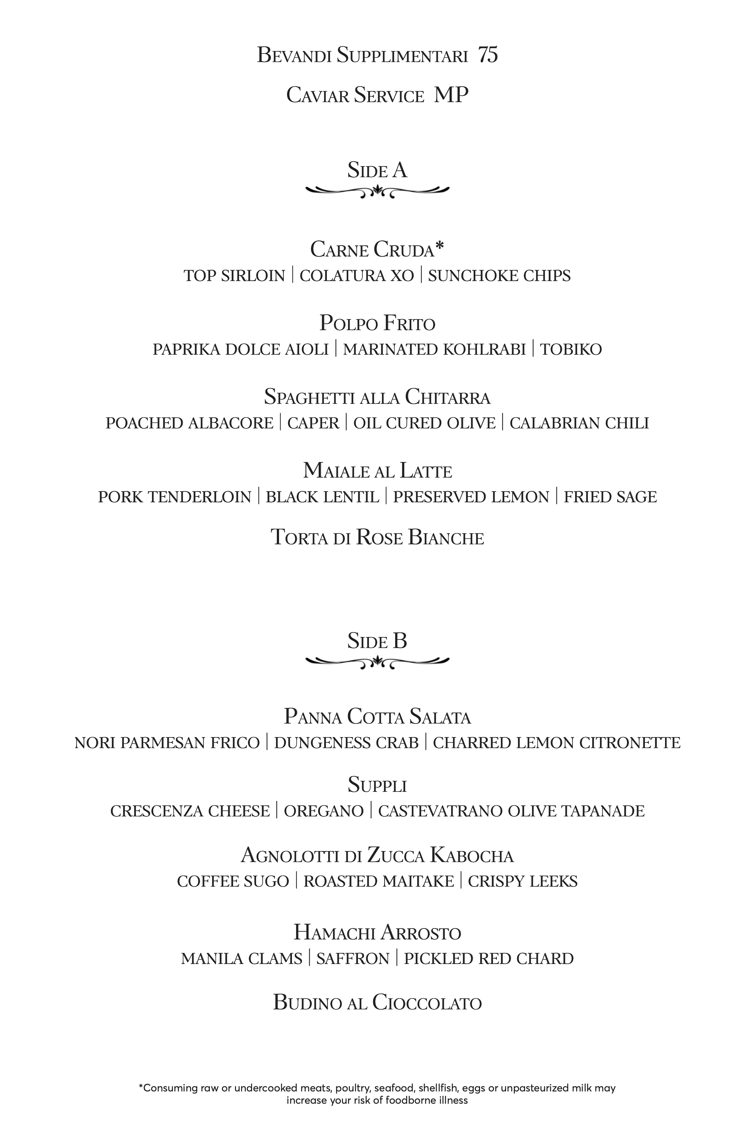 For an added layer of indulgence, enhance your evening with our optional caviar service, showcasing only the finest selections. Turn your evening to 11 with our bevande supplementari—cocktail and vino pairings thoughtfully curated by the Mezza team to perfectly complement each course.